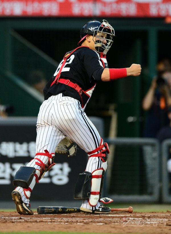 8일 대전 한화생명이글스파크에서 ‘2019 신한은행 MY CAR KBO리그’ LG 트윈스와 한화이글스 경기가 열렸다. 8회말 2사 2루 한화 최진행이 외야플라이로 아웃되자 LG 포수 전준호가 기뻐하고 있다.