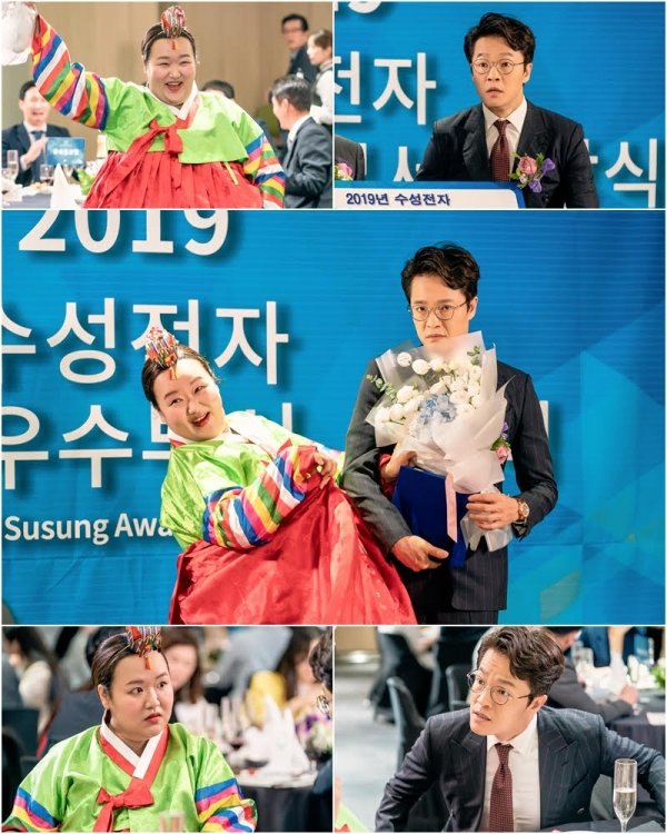 하재숙이 연회장을 들썩이게 만든 ‘끝판왕 깽판’ 장면은 지난달 15일 경기도 수원시 영통구에 위치한 한 컨벤션 센터에서 진행됐다. 이날 하재숙은 조한철에게 생각지 못한 서프라이즈를 안겨주는 우스꽝스러운 상황을 그려내기 위해 특수 분장을 하는 동안에도 감독에게 여러 가지 의견을 제시하는가 하면, 조한철과 디테일하게 의논을 나누며 극적 재미를 더하기 위해 최선을 다했다.