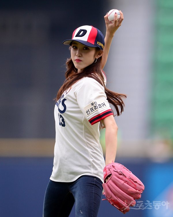 가수 겸 배우 전효성이 시구행사에서 힘차게 공을 던지고 있다.