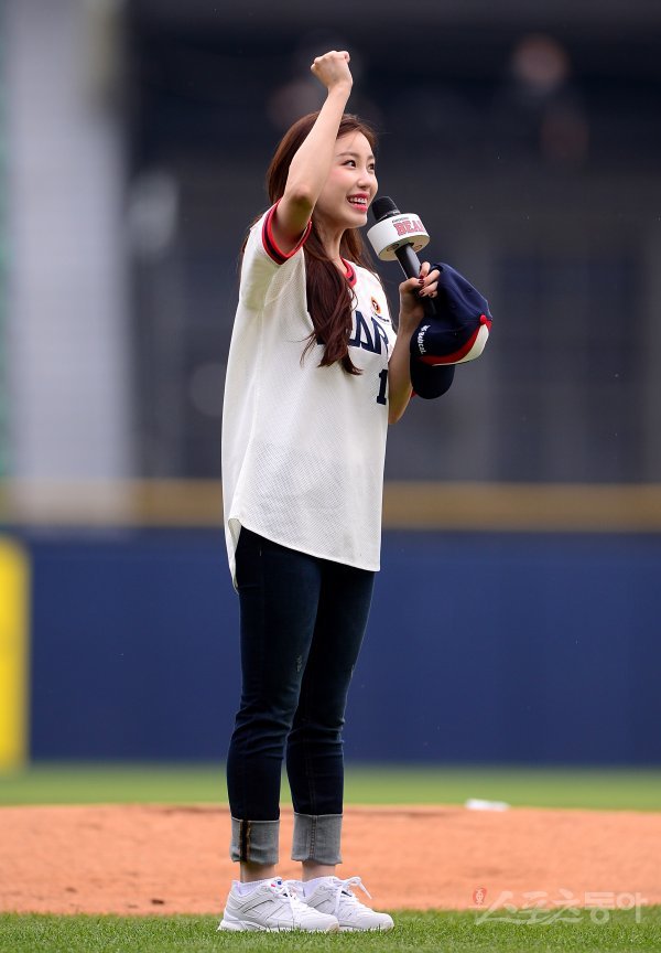 가수 겸 배우 전효성이 시구를 하기 전 인사말을 하고 있다.