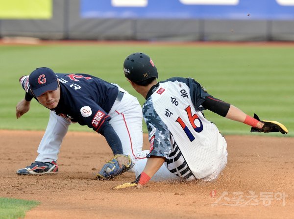 3회말 2사 2루에서 kt 조용호의 타석 때 1루 주자 박승욱이 2루 도루에 성공하고 있다.