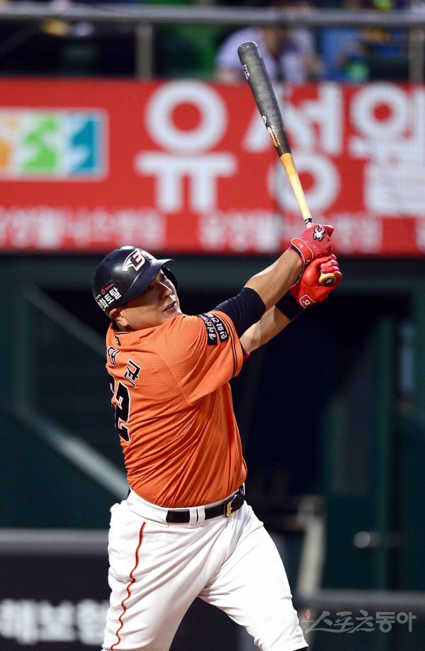 7회말 2사 한화 김태균이 우전 2루타를 치고 있다.