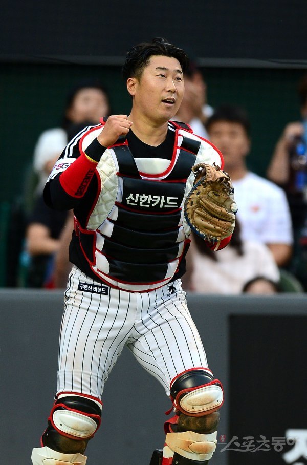 5회말 2사 LG 이성우가 파울볼을 잡아 이닝을 종료시킨 후 주먹을 쥐고 있다.