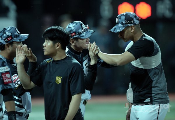 kt가 롯데에 2-0으로 승리한 뒤 이강철 감독이 쿠에바스를 격려하고 있다.
