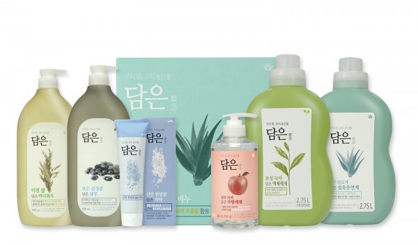 애경산업이 농협 조합원들이 수확한 농산물 추출물을 담은 자연주의 홈케어 브랜드 ‘담은’(사진)을 론칭했다. 브랜드명은 우리 땅에서 자란 좋은 원료를 담았다는 뜻이다. 보성 녹차 담은 액체 세제, 제주 알로에 담은 섬유유연제, 상주 사과 담은 주방세제, 보은 검정콩 담은 샴푸, 이천 쌀 담은 바디워시, 담은 치약, 제주 알로에 담은 비누 등 총 7종으로 구성했다. 19일까지 2만 원 이상 구매 고객을 대상으로 추첨을 통해 경품을 제공한다.