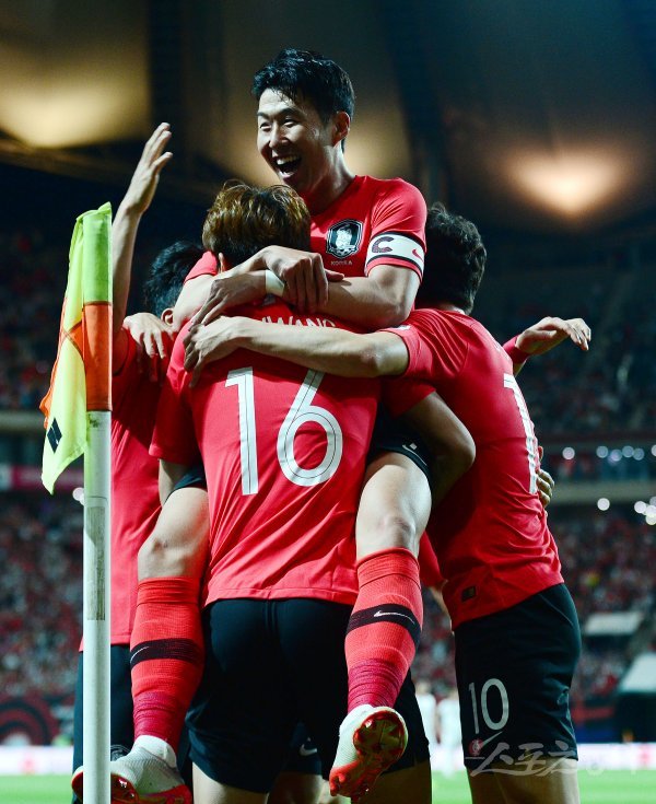 한국 황의조가 슛을 성공한 뒤 손흥민의 환영을 받고 있다.