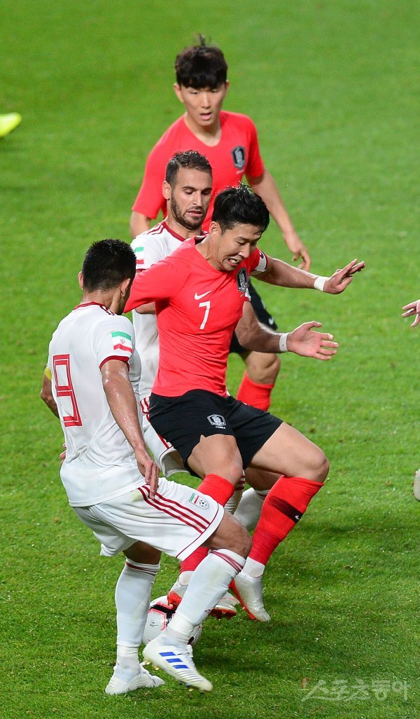 11일 서울월드컵경기장에서 열린 한국 축구대표팀과 이란 경기에서 한국 손흥민이 이란의 수비를 뚫고 공격하고 있다.