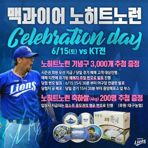 삼성 라이온즈는 12일 “15일 대구삼성라이온즈파크에서 열리는 KT 위즈와 홈경기에서 덱 맥과이어의 노히트노런 달성 기념행사를 가진다”고 밝혔다.