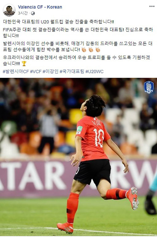 이강인(18)의 소속팀 스페인 프리메라리가 발렌시아가 U-20월드컵 결승에 오른 한국대표팀에 축하 메시지를 보냈다.