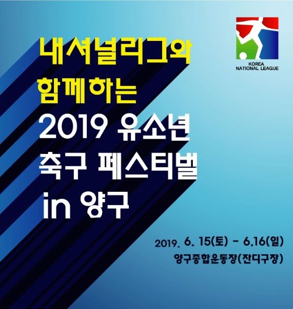 KOREA NATIONAL LEAGUE(회장 김기복)가 오는 15일(토)과 16일(일) 양 일간에 걸쳐 ‘내셔널리그와 함께하는 2019 유소년 축구 페스티벌 in 양구’를 개최한다.