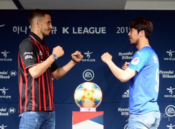 16일 서울월드컵경기장에서 열리는 FC서울과 수원삼성의 슈퍼매치 미디어데이가 13일 서울 종로구 신문로 축구회관에서 열렸다. FC서울 페시치와 수원삼성 한희권이 포토타임을 갖고 있다.