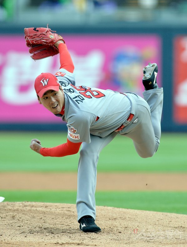 SK 선발투수 김광현이 힘차게 볼을 던지고 있다.