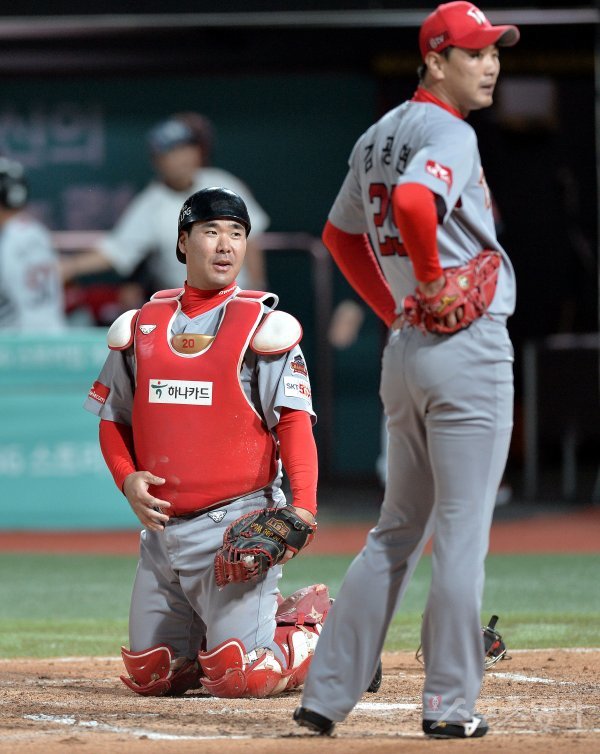 6회말 1사 만루에서 kt 오태곤의 내야 땅볼 때 SK 이재원이 볼을 놓치는 사이 3루 주자 강백호가 득점에 성공하자 이재원과 김광현이 아쉬워하고 있다.