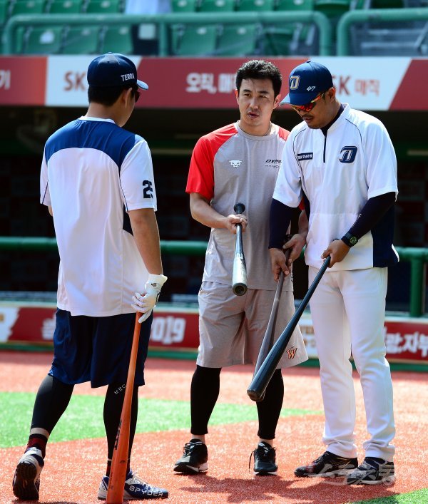 경기 전 NC 이호준 코치가 SK 김강민으로부터 배트를 선물받고 있다.
