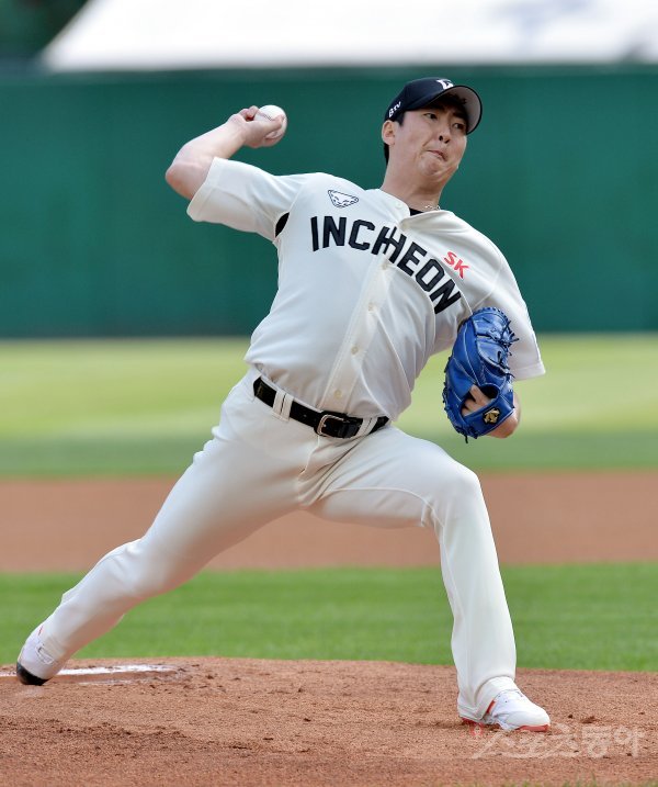 SK 선발투수 문승원이 힘차게 볼을 던지고 있다.