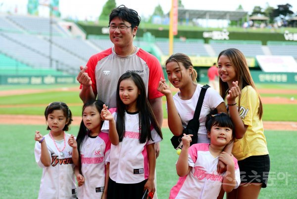 SK가 NC에 9-2로 승리한 뒤 박정권이 두 딸과 이동국의 두 쌍둥이딸과 함께 기념촬영을 하고 있다.