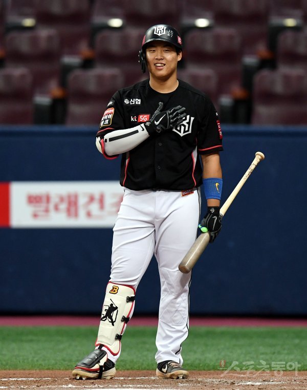 3회초 2사 1루에서 kt 강백호의 파울 타구가 kt 더그아웃으로 들어가자 강백호가 미안해하고 있다.