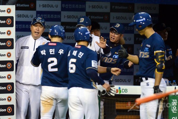 2회초 2사 2,3루 NC 박석민 2타점 적시타 때 득점한 선수들이 이동욱 감독의 축하를 받고 있다.