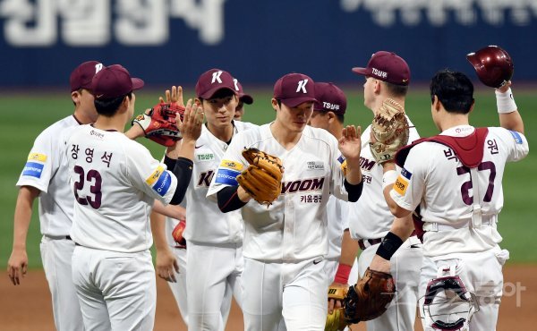키움이 kt에 3-2로 승리한 뒤 선수들이 그라운드에서 기쁨을 나누고 있다.