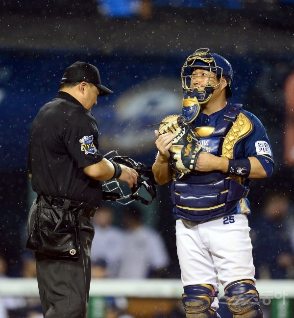 5회말 NC 양의지가 비가 오는 하늘을 바라보고 있다.