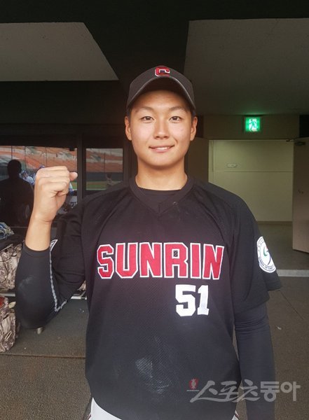 선린인터넷고등학교 우완투수 최수형이 19일 목동구장에서 열린 제73회 황금사자기 전국고교야구대회 겸 주말리그 왕중왕전(동아일보·스포츠동아·대한야구소프트볼협회 공동주최) 비봉고등학교전에서 6이닝 1실점(비자책) 호투를 한 뒤 사진촬영을 하고 있다. 목동|장은상 기자 award@donga.com