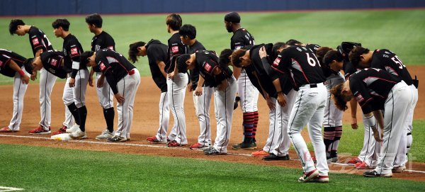 키움에 1-3으로 패한 kt 선수들이 팬들을 향해 고개 숙여 인사하고 있다.