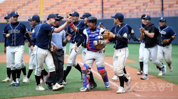인상고가 북일고에 15-2로 5회 콜드 게임 승을 거둔 뒤 선수들이 그라운드에서 기쁨을 나누고 있다.