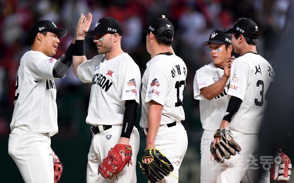 SK가 두산에 3-2로 승리하며 시리즈 스윕을 기록한 뒤 선수들이 그라운드에서 기쁨을 나누고 있다.