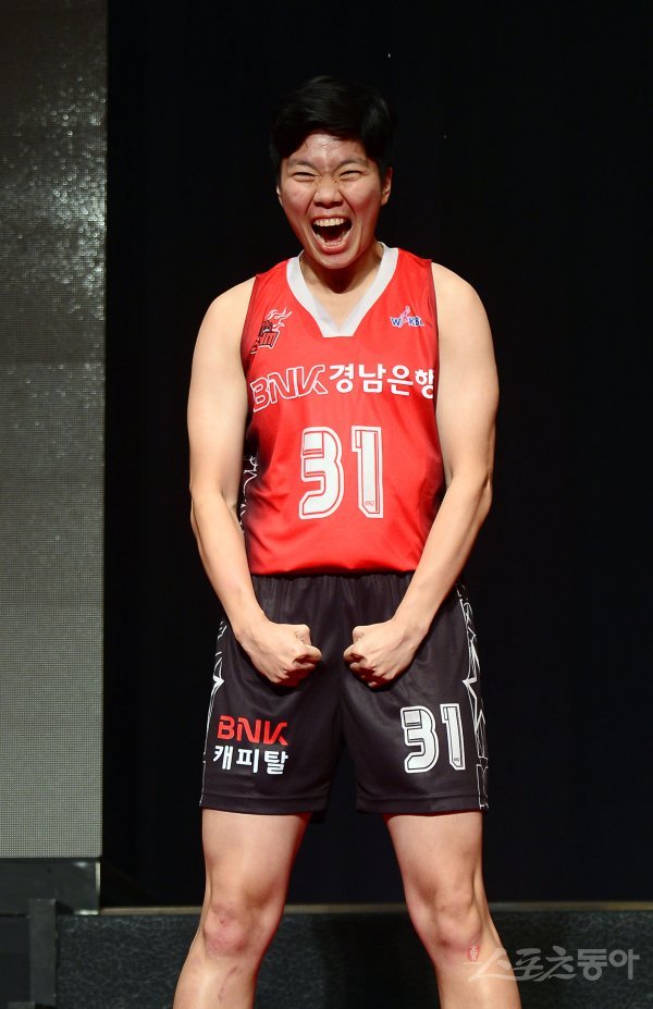 24일 부산 롯데호텔에서 열린 BNK 썸 여자프로농구단 창단식 유니폼 발표에서 진안이 홈 유니폼을 입고 포즈를 취하고 있다.