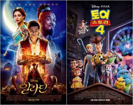 ‘알라딘’은 개봉 34일 만에 700만 관객을 돌파하고 ‘토이 스토리4’는 역대 픽사 애니메이션 중에 최고 오프닝 스코어를 기록하고 있어 계속해서 흥행 청신호를 켤 수 있을지 주목되고 있다.
