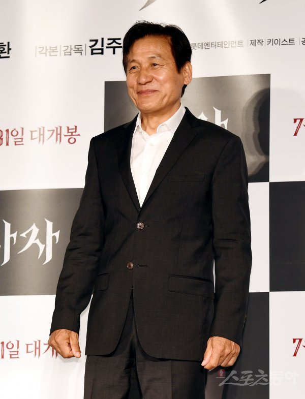 26일 서울 광진구 롯데시네마 건대점에서 영화 ‘사자(감독 김주환)’ 제작 보고회가 열렸다. 악을 쫓는 구마 사제 안신부 역의 안성기가 카메라를 향해 포즈를 취하고 있다.