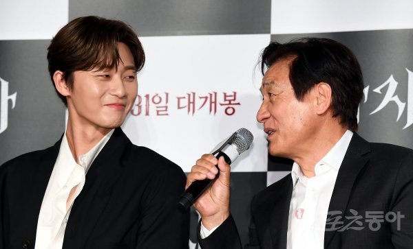 26일 서울 광진구 롯데시네마 건대점에서 영화 ‘사자(감독 김주환)’ 제작 보고회가 열렸다. 안성기가 박서준의 매력에 대해 설명하고 있다.