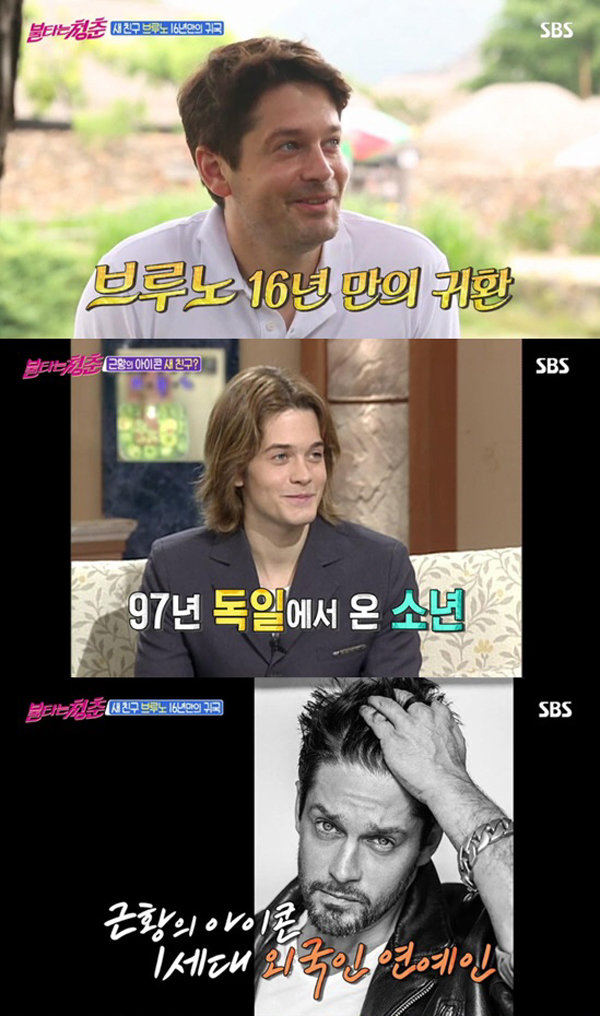 25일 방송된 SBS ‘불타는 청춘’에서는 전남 순천으로 떠난 멤버들의 모습이 그려졌다. 이날 새 친구로 등장한 브루노는 오래 전 한국을 떠난 후의 근황을 전했다. 미국에 10년간 살면서 인기 드라마 ‘로스트’ ‘크리미널 마인드’ 등에 출연한 그는 현재 독일에서 배우로 활동하며 퓨전 한식당을 운영 중이라고 밝혔다.
