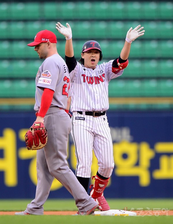 26일 서울 잠실야구장에서 ‘2019 신한은행 MY CAR KBO리그’ SK 와이번스와 LG 트윈스의 경기가 열렸다. LG 이형종이 1회말 1사 1루에서 적시 2루타를 친 후 덕아웃을 향해 세리머니를 하고 있다. 잠실 | 김진환 기자 kwangshin00@donga.com