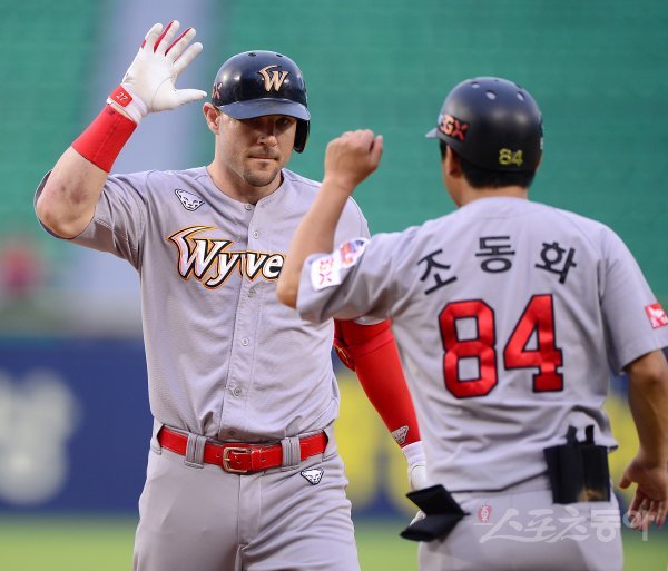 26일 서울 잠실야구장에서 ‘2019 신한은행 MY CAR KBO리그’ SK 와이번스와 LG 트윈스의 경기가 열렸다. SK 로맥이 3회말 1사 2루에서 동점 적시타를 친 후 조동화 코치와 하이파이브를 하고 있다. 잠실 | 김진환 기자 kwangshin00@donga.com