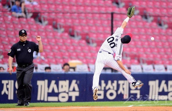 26일 서울 잠실야구장에서 ‘2019 신한은행 MY CAR KBO리그’ SK 와이번스와 LG 트윈스의 경기가 열렸다. LG 3루수 구본혁이 2회초 2사 3루에서 상대 타자의 불규칙 바운드가 된 타구를 잡기 위해 점프하고 있다. 잠실 | 김진환 기자 kwangshin00@donga.com