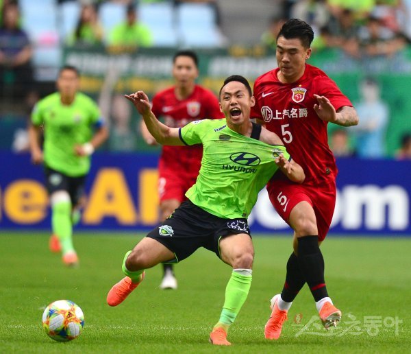 26일 전주월드컵경기장에서 열린 전북 현대와 상하이 상강의 2019 아시아축구연맹(AFC) 챔피언스리그(ACL) 16강 2차전에서 전북 문선민이 상하이 스커의 수비를 뚫고 공격하고 있다. 전주 | 김종원 기자 won@donga.com