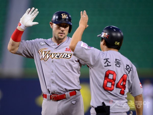26일 서울 잠실야구장에서 ‘2019 신한은행 MY CAR KBO리그’ SK 와이번스와 LG 트윈스의 경기가 열렸다. SK 로맥이 5회초 무사 1,2루에서 역전 적시타를 친 후 조동화 코치와 기쁨을 나누고 있다. 잠실 | 김진환 기자 kwangshin00@donga.com