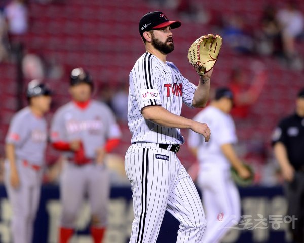 26일 서울 잠실야구장에서 ‘2019 신한은행 MY CAR KBO리그’ SK 와이번스와 LG 트윈스의 경기가 열렸다. LG 선발 켈리가 5회초 1사 만루에서 상대 타자에게 2타점 2루타를 허용한 후 아쉬워하고 있다. 잠실 | 김진환 기자 kwangshin00@donga.com