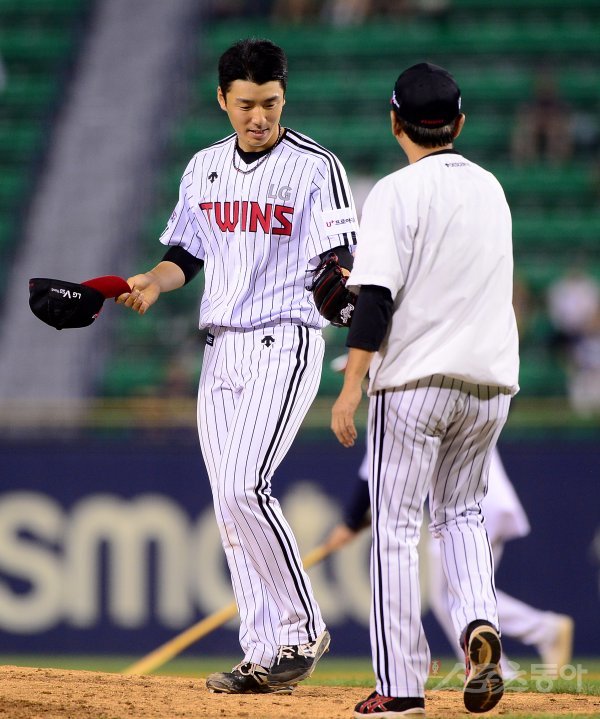 26일 서울 잠실야구장에서 ‘2019 신한은행 MY CAR KBO리그’ SK 와이번스와 LG 트윈스의 경기가 열렸다. LG 한선태가 9회초 등판에 앞서 최일언 투수코치에게 공을 전달받고 있다. 잠실 | 김진환 기자 kwangshin00@donga.com