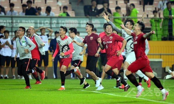 26일 전주월드컵경기장에서 열린 전북 현대와 상하이 상강의 2019 아시아축구연맹(AFC) 챔피언스리그(ACL) 16강 2차전에서 상하이가 승부차기 끝에 8강 진출을 확정지은 후 환호하고 있다. 전주 | 김종원 기자 won@donga.com