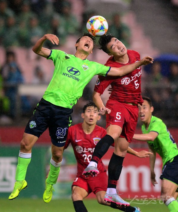26일 전주월드컵경기장에서 열린 전북 현대와 상하이 상강의 2019 아시아축구연맹(AFC) 챔피언스리그(ACL) 16강 2차전에서 전북 손준호와 상항이 스커가 공중볼을 다투고 있다. 전주 | 김종원 기자 won@donga.com