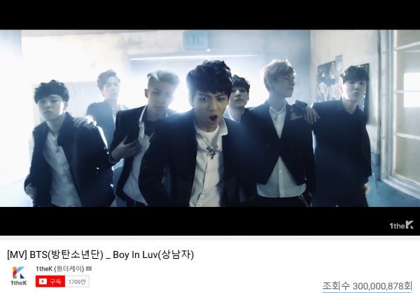 2014년 발매된 두 번째 미니앨범 ‘Skool Luv Affair’의 타이틀곡 ‘상남자’ 뮤직비디오는 30일(오늘) 오전 4시 23분경 조회수 3억 건을 넘었다. 이는 원더케이(1theK) 유튜브 계정에 올라온 ‘상남자’ 뮤직비디오의 단독 조회수로, 소속사 빅히트 엔터테인먼트 공식 계정의 뮤직비디오 조회수와 합산하면 3억 1091만 건을 넘는다.