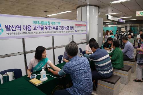 이대서울병원(원장 편욱범)이 개원을 기념해 26, 27일 양일간 서울교통공사 5호선 발산역에서 무료 건강상담 행사를 실시했다. 이대서울병원 의료진이 발산역 지하 1층 사랑의 쉼터에서 지하철 이용 고객들을 대상으로 체성분 분석 및 운동 상담과 혈압, 혈당 측정 등 무료 건강상담을 진행했다.