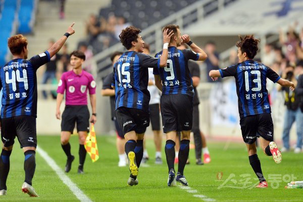 30일 인천 축구전용경기장에서 열린 ‘하나원큐 K리그1 2019’ 인천 유나이티드와 강원 FC의 경기에서 인천 무고사가 선제골을 넣은 뒤 베이비 세리머니를 펼치고 있다.