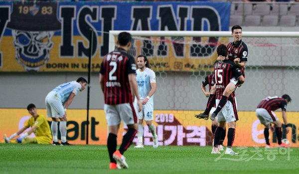 30일 서울월드컵경기장에서 ‘하나원큐 K리그1 2019’ FC 서울과 울산 현대의 경기가 열렸다. 전반 FC 서울 알리바예프가 동점골을 넣은 후 환호하고 있다.
