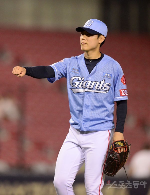 30일 서울 잠실야구장에서 ‘2019 신한은행 MY CAR KBO리그’ 롯데 자이언츠와 두산 베어스 경기가 열렸다. 9회말 등판해 1이닝을 무실점으로 막은 롯데 박진형이 하이파이브 하고 있다.