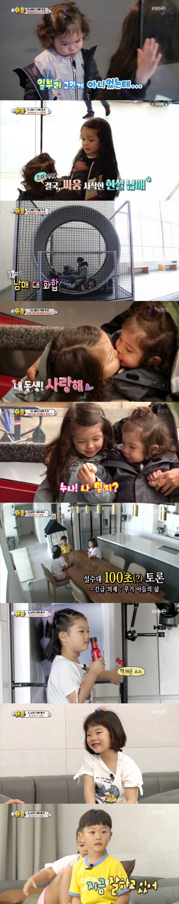 지난 6월 30일 방송된 KBS 2TV '슈퍼맨이 돌아왔다'(이하 '슈돌') 284회는 '네가 웃으면 나도 좋아'는 부제로 꾸며졌다. 그중 설수대 설아-수아-시안 남매와 건나블리 건후-나은 남매는 부제처럼 누나 혹은 동생이 웃어서 더욱 행복한 하루를 보냈다.