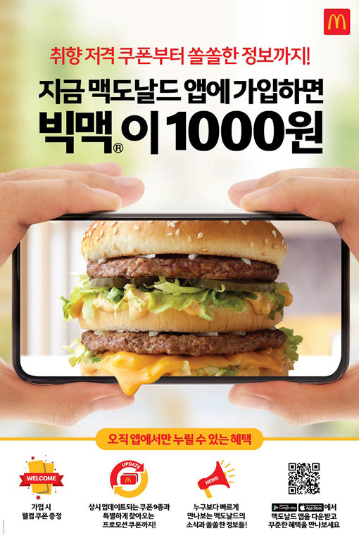 맥도날드가 다양한 정보와 할인 혜택을 제공하는 공식 모바일 플랫폼 ‘맥도날드 앱’을 출시했다고 1일 밝혔다. 맥도날드 앱은 고객이 맥도날드를 보다 스마트하게 즐길 수 있도록 이벤트와 할인 프로모션, 모바일 쿠폰, 신제품, 메뉴 및 레스토랑 관련 소식 등 다양하고 유익한 최신 정보를 제공해 준다. 특히 기간별로 모바일 앱을 통해서만 받을 수 있는 다양한 쿠폰 혜택이 제공된다. 앱 출시를 기념해 7월 1일부터 7일까지는 빅맥을 1000원에 구매할 수 있는 쿠폰을 제공한다. 또한 최초 가입 시 2주 이내 사용할 수 있는 에그불고기 1000원 쿠폰도 증정된다.