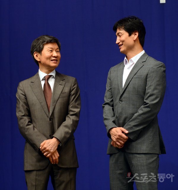 1일 서울 중구 소공동 웨스틴조선호텔에서 열린 ‘FIFA U-20 월드컵 준우승 기념 격려금 전달식’에서 KFA 정몽규 회장이 정정용 감독과 대화를 나누고 있다.